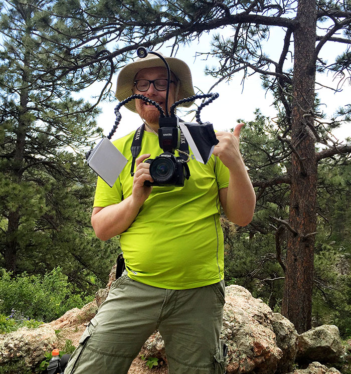 Here I am, sporting both the 15mm macro lens and the double flash system. Silly, no?