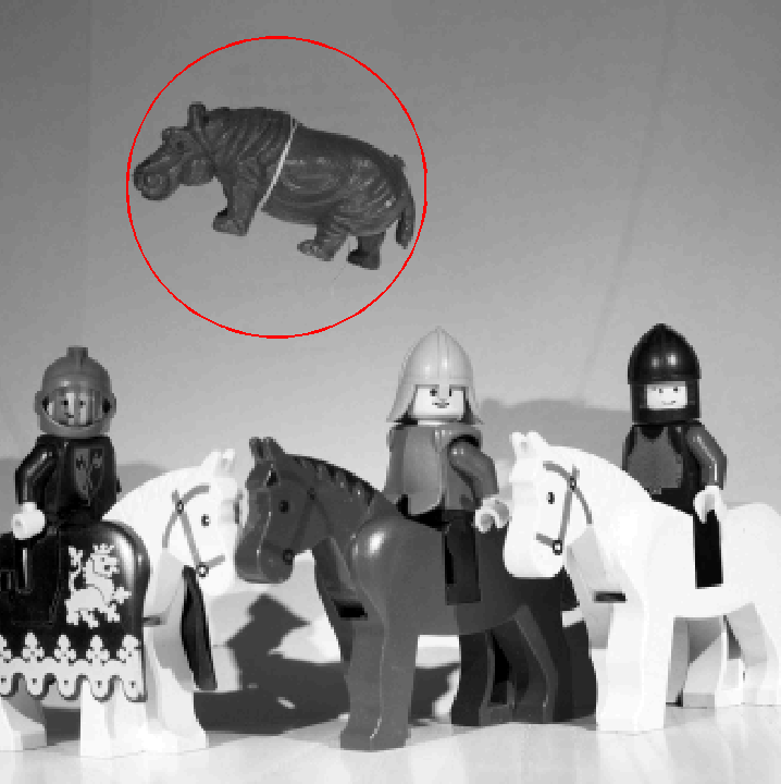 I teach mathematics at University of Helsinki, Finland. Last fall I wanted to include some contemporary applications in the course material, so we simulated a so-called "photobomb" in class. You can see the image below. There are some Lego knights posing formally, but a flying hippo is ruining the shot (Thus the use of the term "photobomb"). I showed the class how to remove such a nuisance using a classical mathematical technique called "Poisson kernel." Results are shown below.